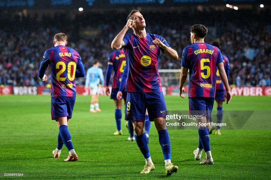 Robert Levandovski ushbu o'yinda xet-trik qayd etdi (10-p, 37, 74). Lamin Yamal ham o'z hisobiga gol yozdirib qo'ydi (45+4). Mezbonlar safida Serxio Karreyra (11) va Borxa Iglesias (43) to'p kiritdi. Bahs so'nggida kataloniyaliklar yarim himoyachisi Frenki de Yong (90+4) ikkinchi sariq kartochkani olib maydonni biroz erta tark etdi.